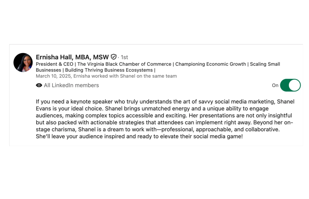 Whether your a large corporation, small business, or solopreneur, Shanel is the missing ingredient to your social media strategy.