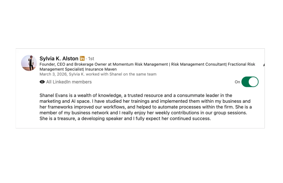 Shanel is the most amazing social media genius I have ever seen. She has challenged me to work toward coming into the light about my work and expertise. She is the real deal.
